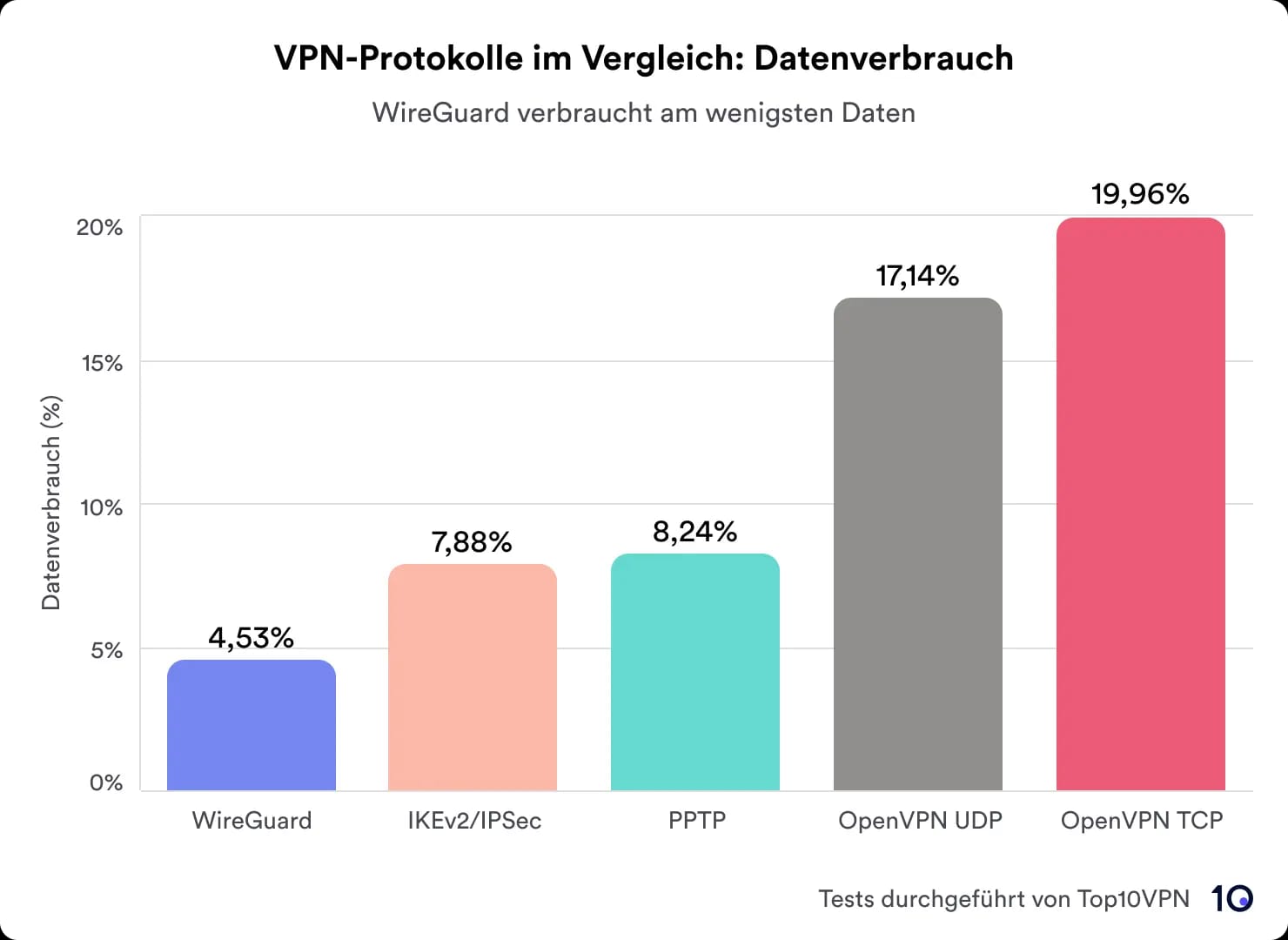 - WireGuard verwendet die geringste Datenmenge – nur 4,53%.