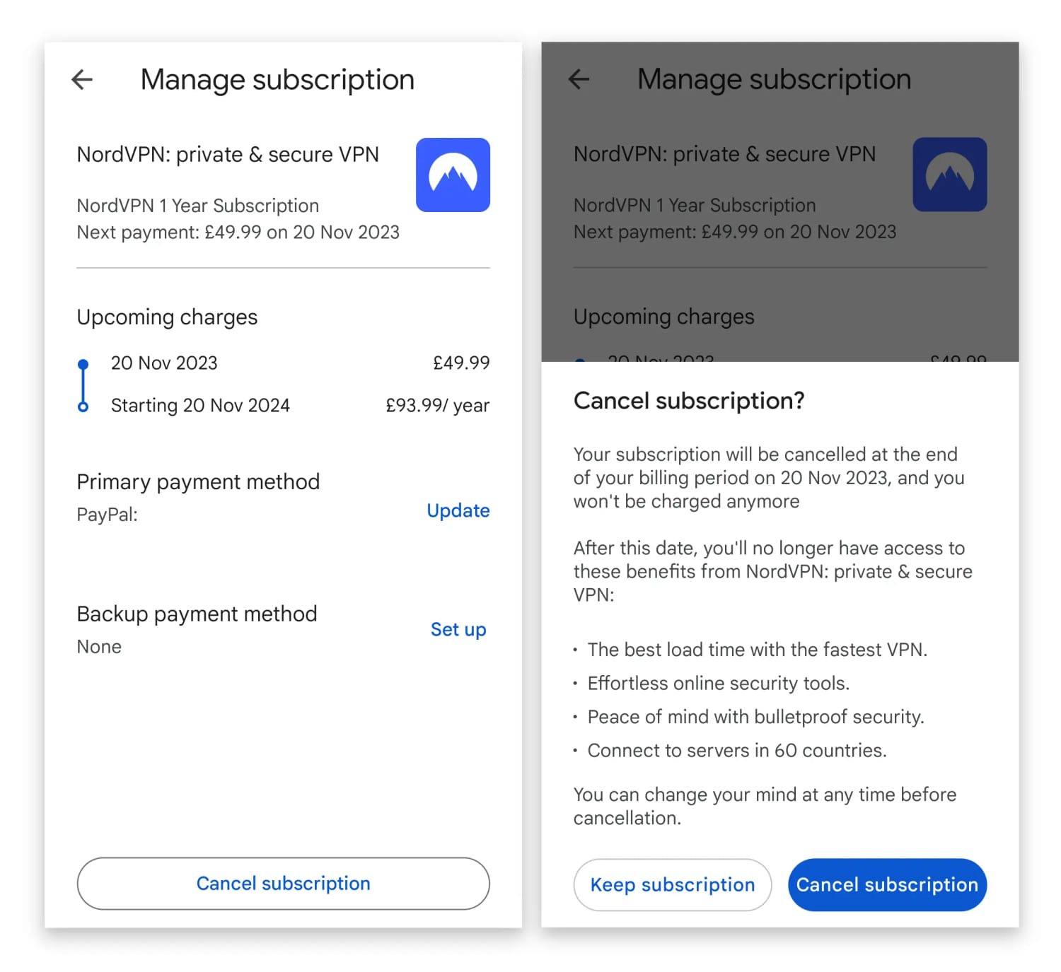 Si no quieres seguir usando NordVPN, recuerda cancelar la prueba en un plazo máximo de 7 días desde la sección Suscripciones en la aplicación de Google Play Store.