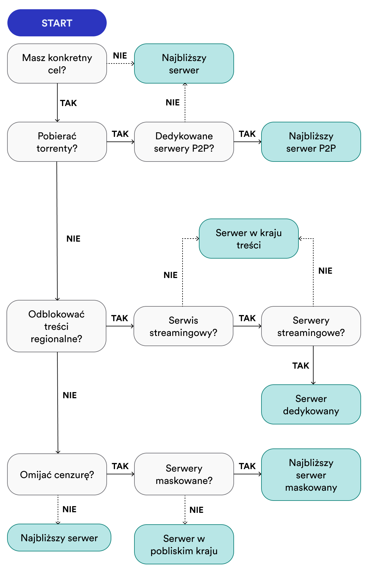 Aby ułatwić Ci zadanie, stworzyliśmy poniższy schemat pokazujący, który serwer VPN należy wybrać w zależności od Twoich potrzeb: